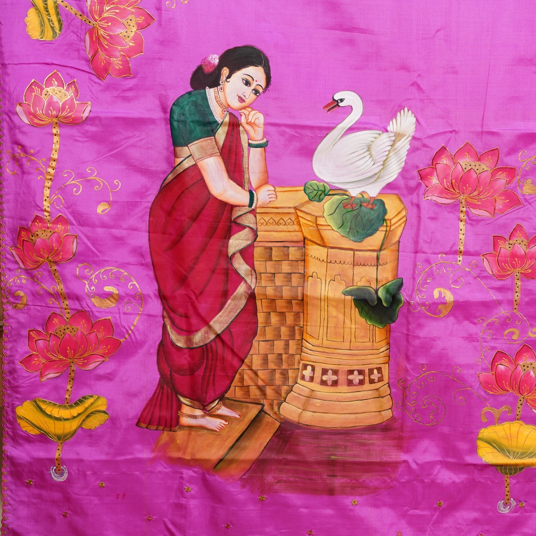 This Handprinted Silk Saree inspired from Raja Ravi Varma’s Damayanti with Swan, combines timeless elegance with artistic craftsmanship, offering a luxurious piece of wearable art.