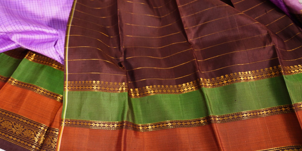 - Color Palette: Features a striking combination of lavender with a subtle checked pattern for the body and vibrant green and rust-orange for the pallu and border, accented by rich maroon hues.