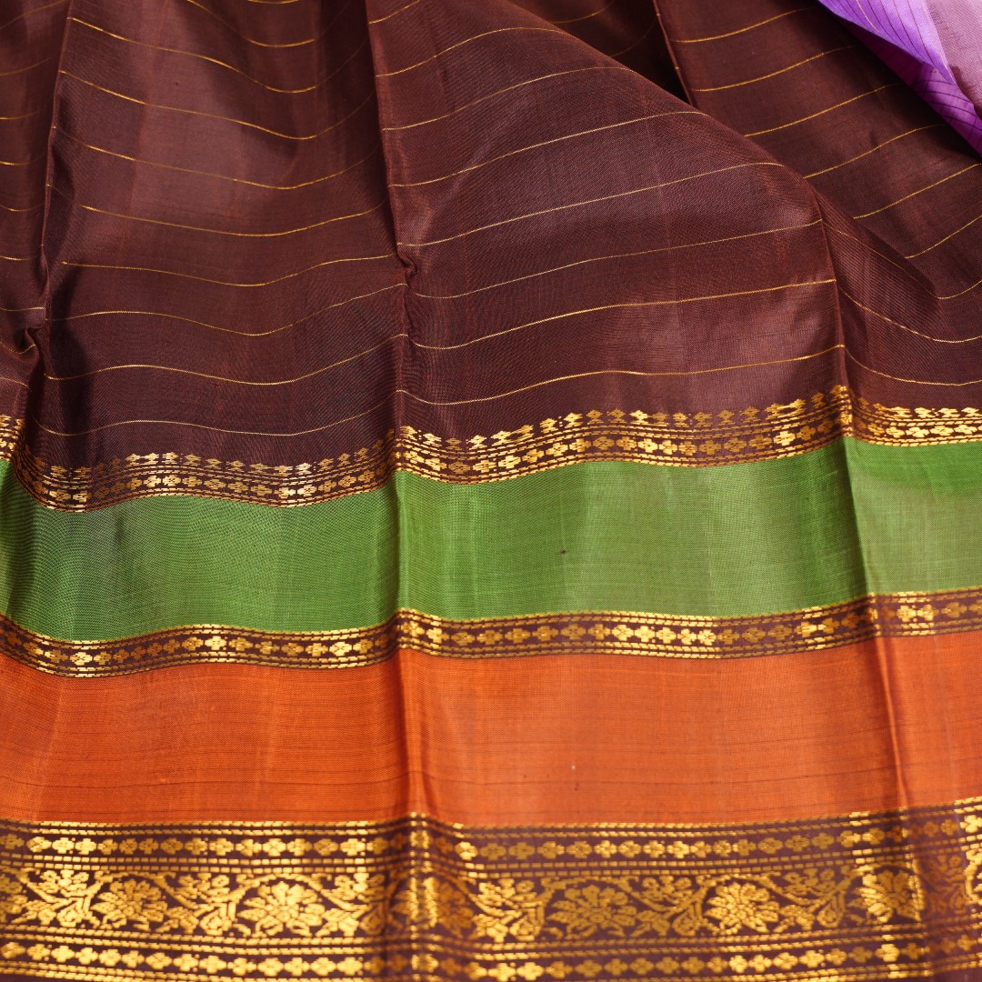- Color Palette: Features a striking combination of lavender with a subtle checked pattern for the body and vibrant green and rust-orange for the pallu and border, accented by rich maroon hues.